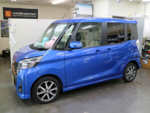 カーフィルム デイズルークスのウィンドフィルム 2025年10月28日 ks デイズルークスさんのウィンドフィルム施工が完了。 リア・リアサイドへの断熱仕様スモークフィルムの貼付けです。 メーカー純正スモークドガラスでは透過率が高い(薄い)ため、フィルム施工することにより、かなり濃く感じよくなりましたね!
