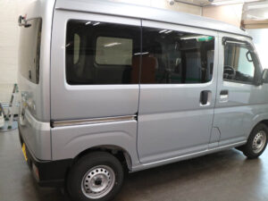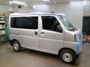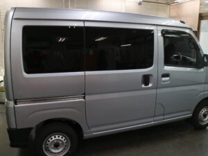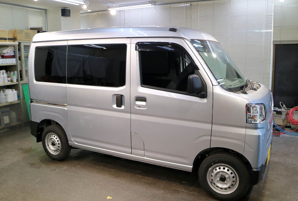 カーフィルム ハイゼットのウィンドフィルム 2026年2月21日 ks 新車ハイゼットさんのウィンドフィルム施工が完了。 メーカー純正着色ガラスの可視光線透過率が高いため、真っ黒に仕上げます。 貼付け前です。 かなり薄くて車内がまあまあ見えますね。 スーパースモークを貼付け完了。 外からは車内がほとんど見えないですね。